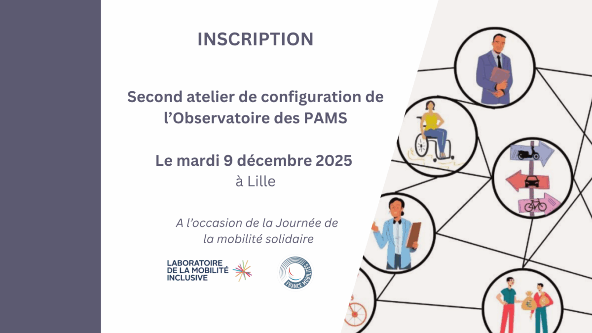 Le Laboratoire de la Mobilité Inclusive et ses partenaires vous invitent à participer au second atelier de configuration de l’Observatoire des PAMS et de la mobilité solidaire : Un Observatoire comment faire ? A l’occasion de la journée de la mobilité solidaire, le 9 décembre 2025, de 9h à 17h, à Lille.